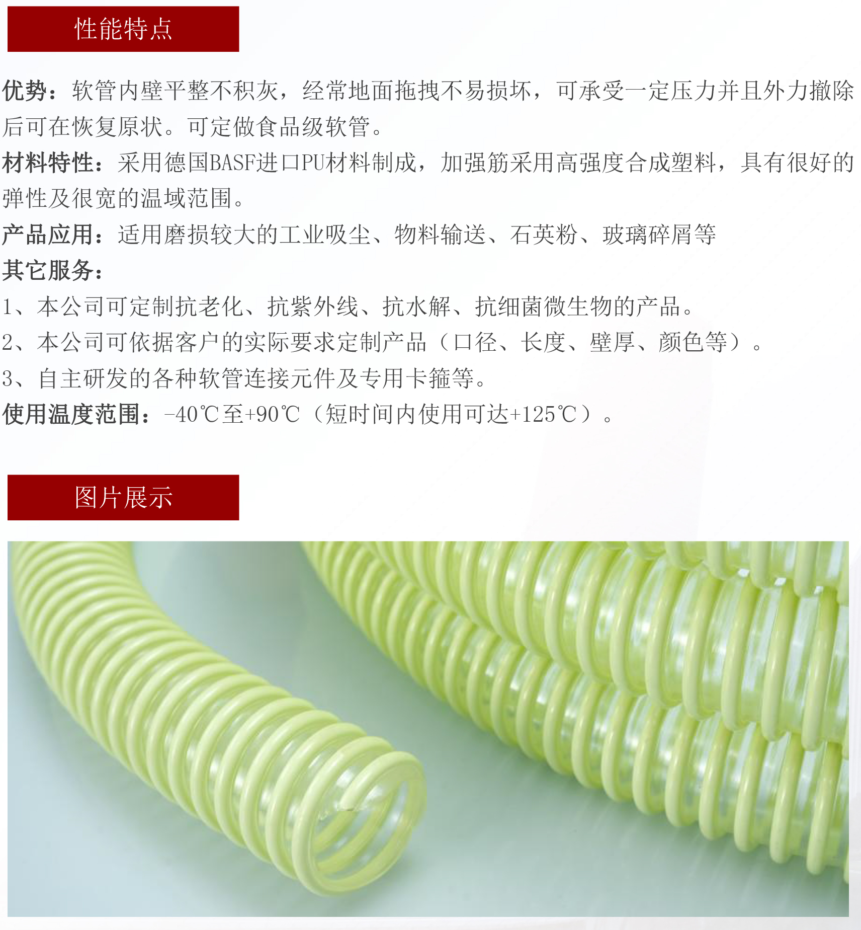 产品特点:材料特性:采用德国BASF进口PU材料制成,加强筋采用高强度合成塑料,具有很好的弹性及很宽的温域范围。产品应用:适用磨损较大的工业吸尘、物料输送、石英粉、玻璃碎屑等。