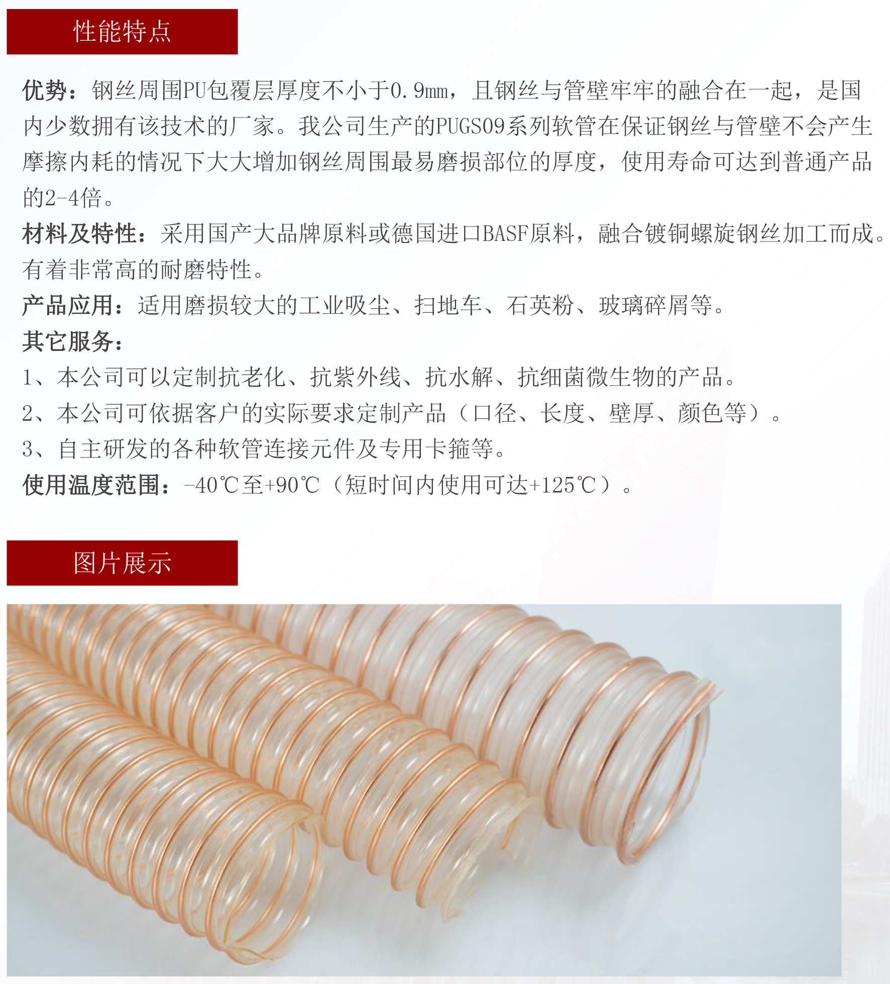 材料特性:德国进口BASF原料,融合镀铜螺旋钢丝加工而成,有着非常高的耐磨特性。产品应用:适用磨损较大的工业吸尘、扫地车、石英粉、玻璃碎屑等。
