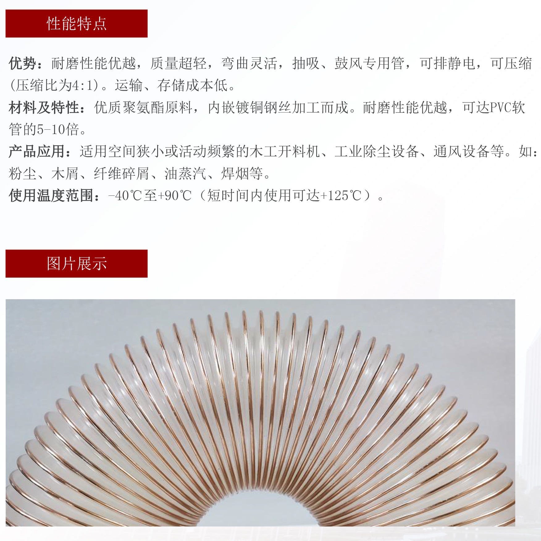 产品特点:材料特性:优质聚氨酯原料,内嵌铜钢丝加工而成,耐磨性能优越,可达PVC软管的5-10倍。产品应用:适用空间狭小或活动频繁的工业除尘设备、通风设备等。如:粉尘、木屑、纤维碎屑、油蒸汽、焊烟等。