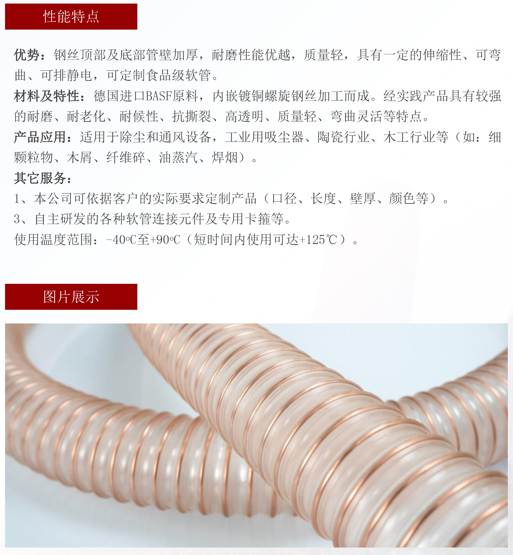 材料特性:优质聚氨酯原料,内嵌铜钢丝加工而成,耐磨性能优越,可达PVC软管的5-10倍。产品应用:适用空间狭小或活动频繁的工业除尘设备、通风设备等。如:粉尘、木屑、纤维碎屑、油蒸汽、焊烟等。