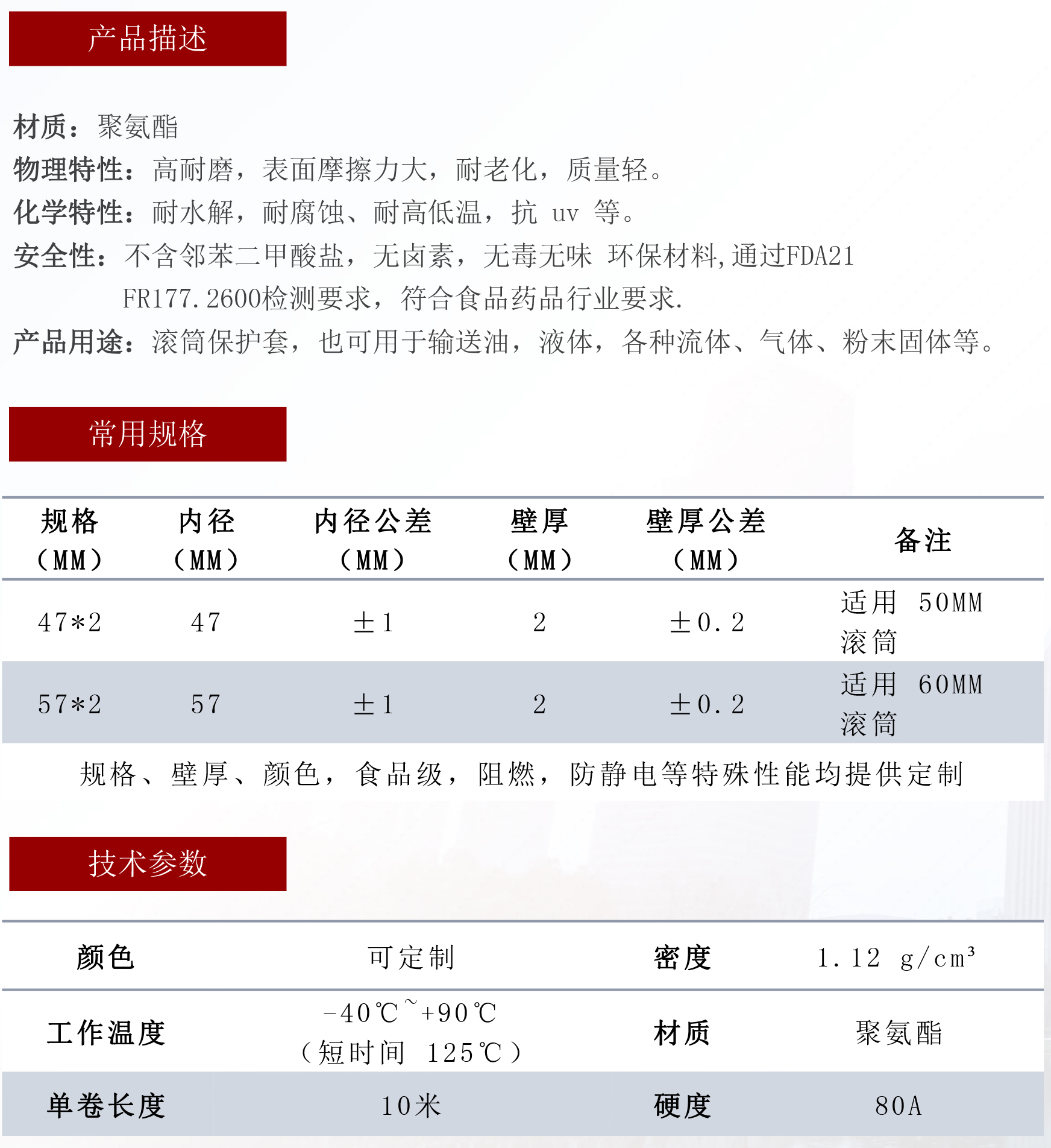 采用TPU材料生产的软管具有抗拉伸、张力强、撕裂强度高、耐磨损、耐折曲、耐穿透、耐低温、耐水解等性能,并具有很好的回弹性且使用寿命长。本品不含增塑剂,无毒无味,是一种高性能环保型软管。是PVC、橡胶软管的替代产品。