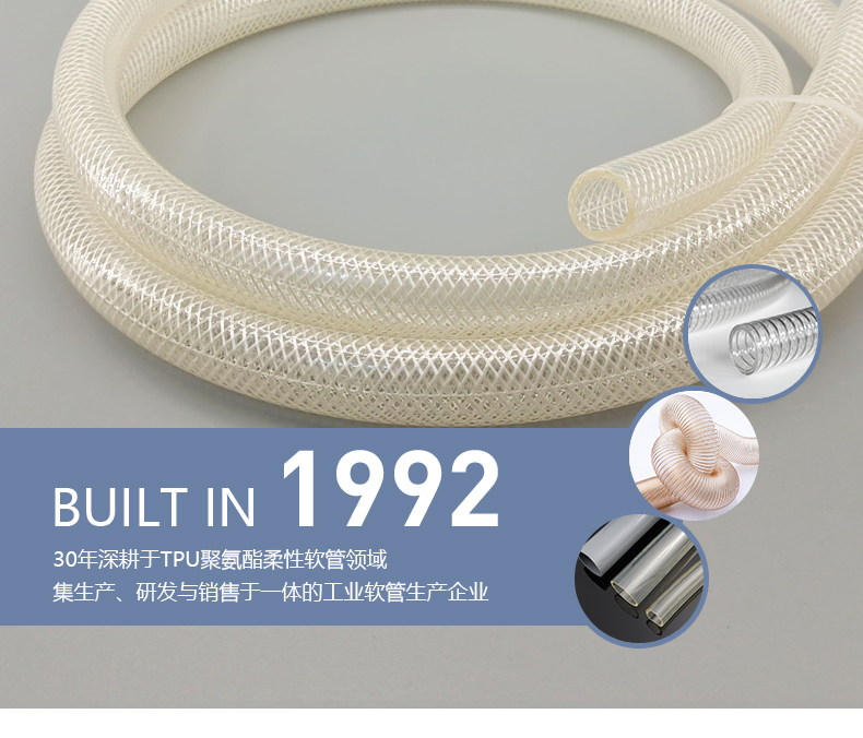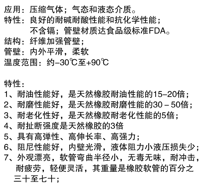 采用TPU材料生产的软管具有抗拉伸、张力强、撕裂强度高、耐磨损、耐折曲、耐穿透、耐低温、耐水解等性能,并具有很好的回弹性且使用寿命长。本品不含增塑剂,无毒无味,是一种高性能环保型软管。是PVC、橡胶软管的替代产品。