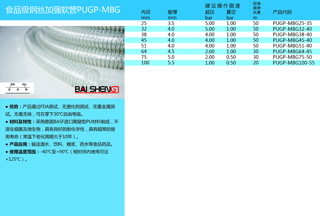 产品特点:本产品无毒无味,不含塑化剂,符合食品标准,可应用于食品、酿酒、饮料、医药、卫生等行业,是高压、抽吸、输送水、油、糖浆等液体的适用管材。