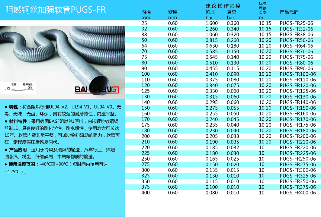 材料特性:采用德国BASF阻燃PU原料,内嵌螺旋镀铜钢丝职称,具有良好的耐化学性、耐水解性。软管内壁非常平整,可减少物料流动阻力,软管可在一定程度碾压后恢复原状。